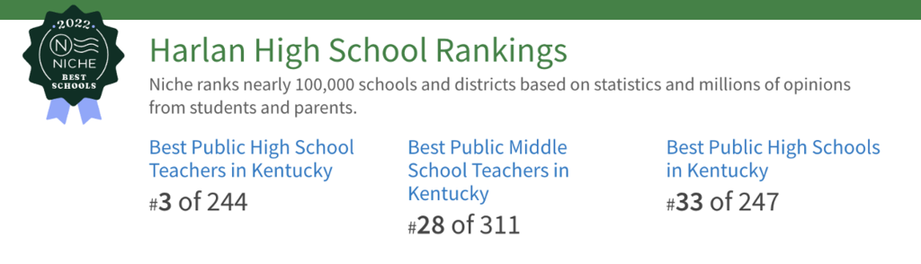 Harlan Independent Ranked 2023 #6 Best School District in KY by Niche.com. UP six spots from 2022. Top 1% teaching staff in US. Read all about it here: https://www.harlan-ind.k12.ky.us/article/863725
